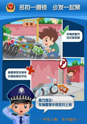 多上一道锁,少发一起案:对于校园内的自行车停放,童鞋们不要嫌麻烦,早一点去教室,将车停放好,多上一道锁,省掉不必要的麻烦。