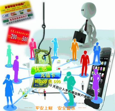 花200元能充500元话费?日前,警方捣毁了一个冒充移动公司人员销售虚假移动手机充值卡的犯罪团伙。其承诺可以通过公司回拨业务降低话费,15日后将500元话费自动充到用户账户。校保卫处提醒:类似业务早在07年已被工信部叫停,大家千万不要上当!